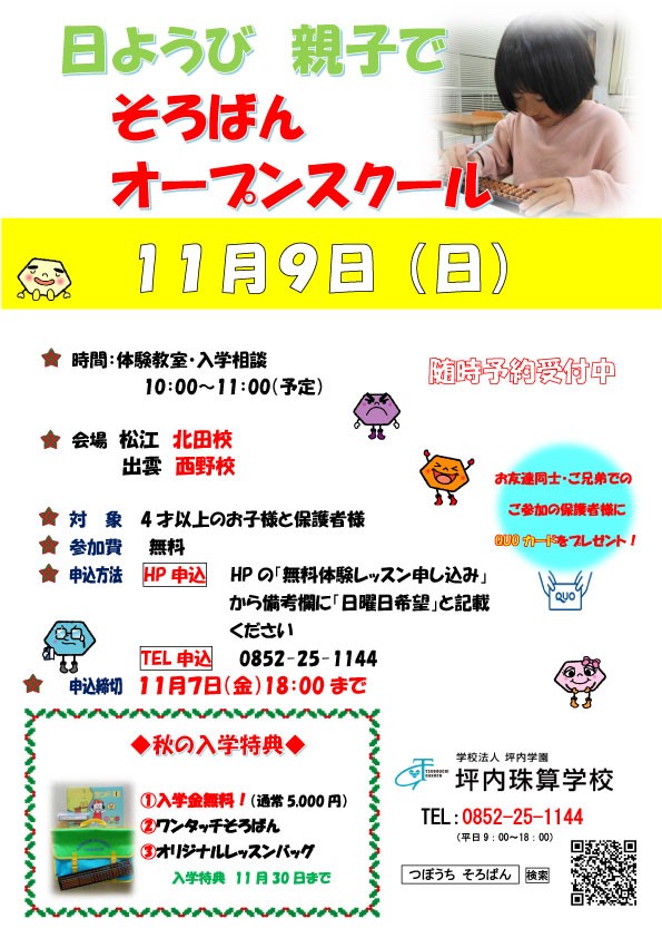 11月9日(日)に『日ようび親子でそろばんオープンスクール』を開催します!